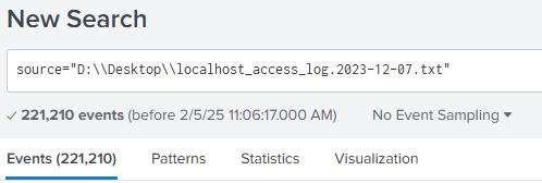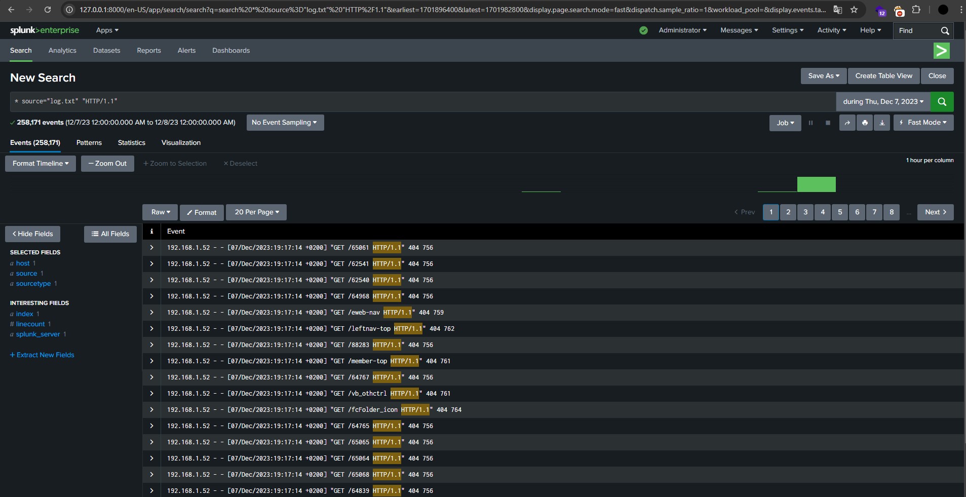 You applied a time filter as during Thu, Dec 7, 2023. Why did you apply a time filter in the Splunk search? If you select the “All time” option, it will display all requests. Since all these logs are access log entries, they are all web requests, so there’s no need to filter by HTTP/1.1.